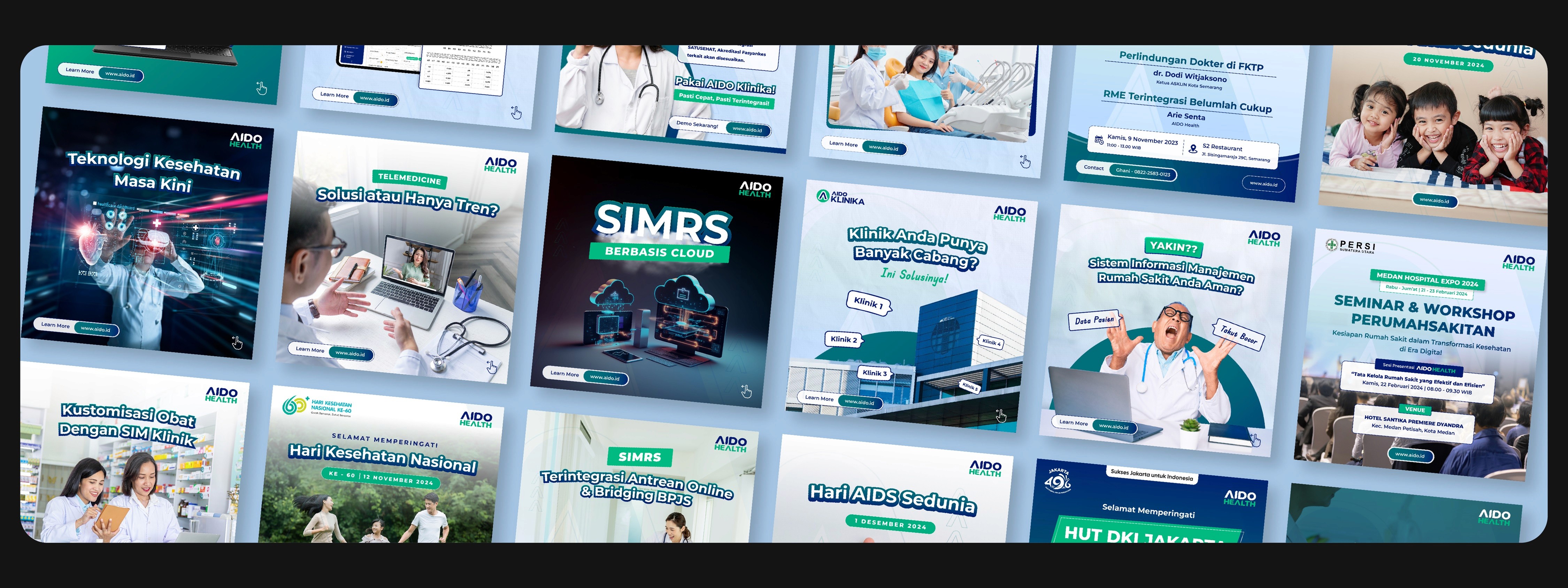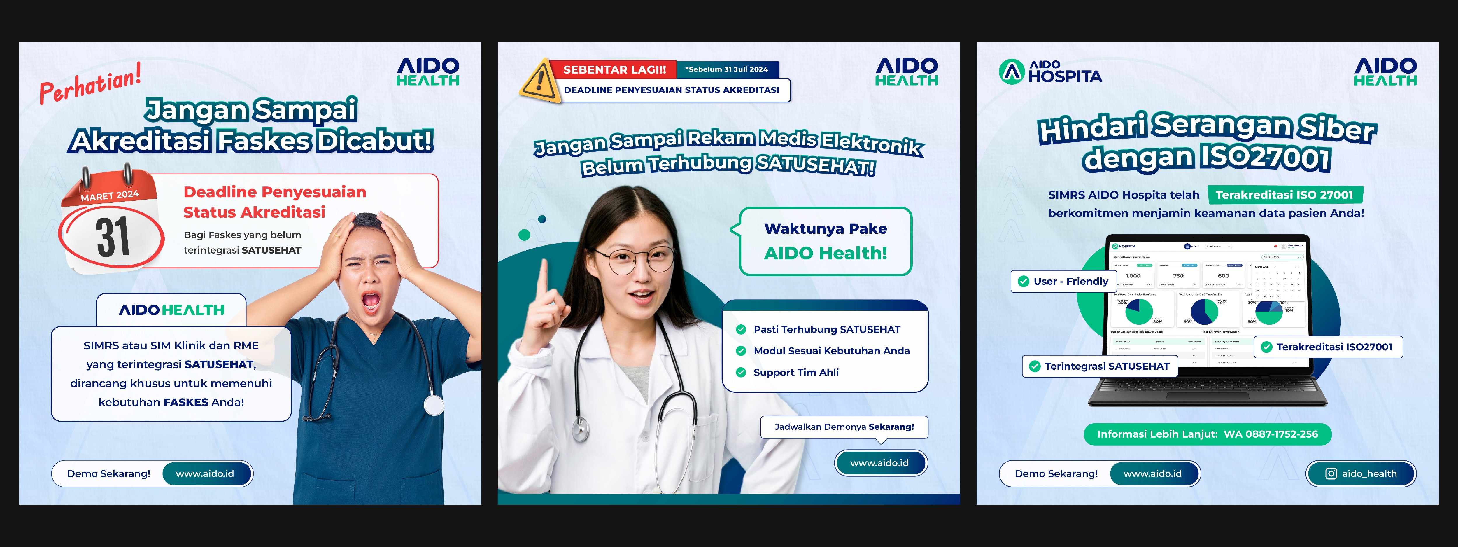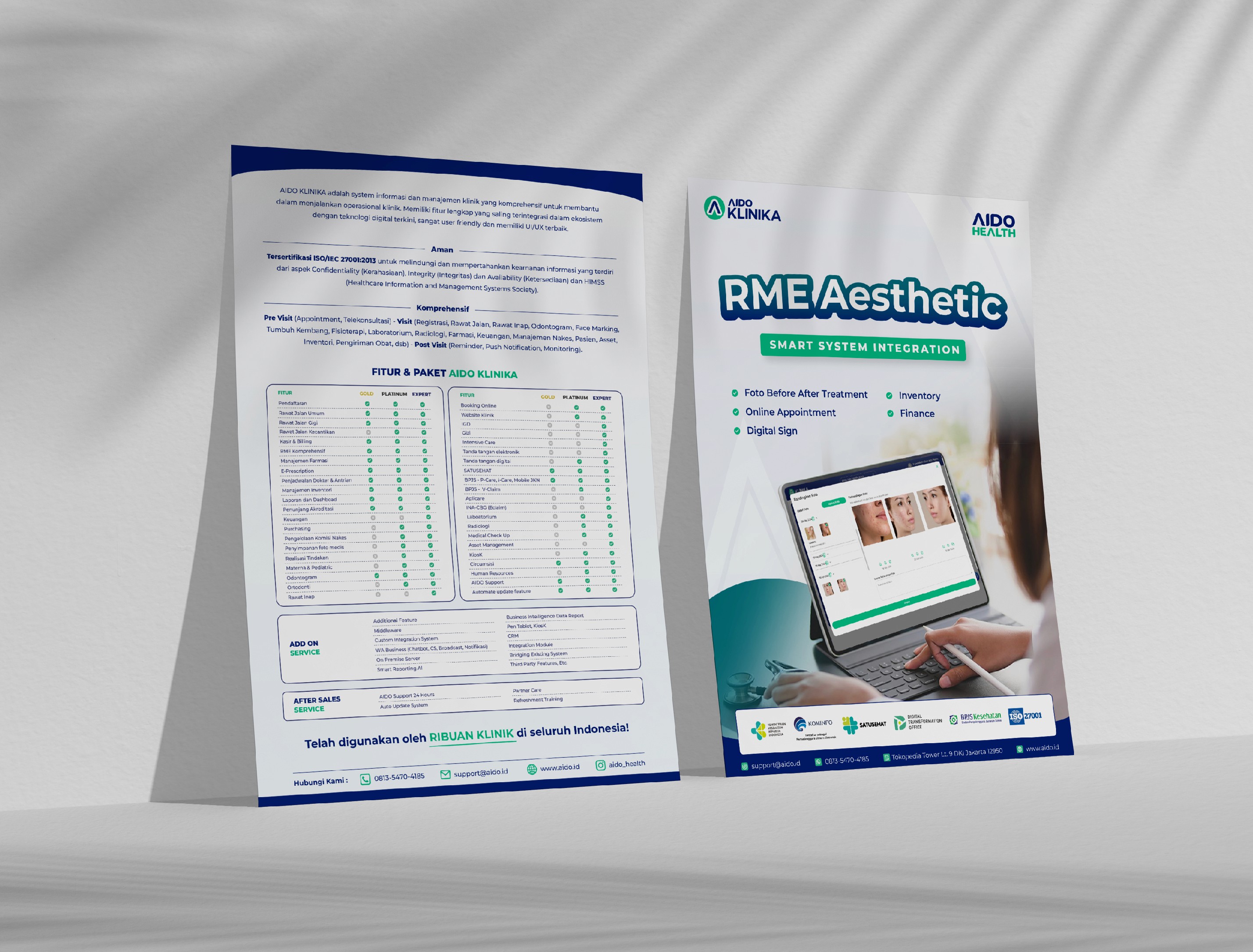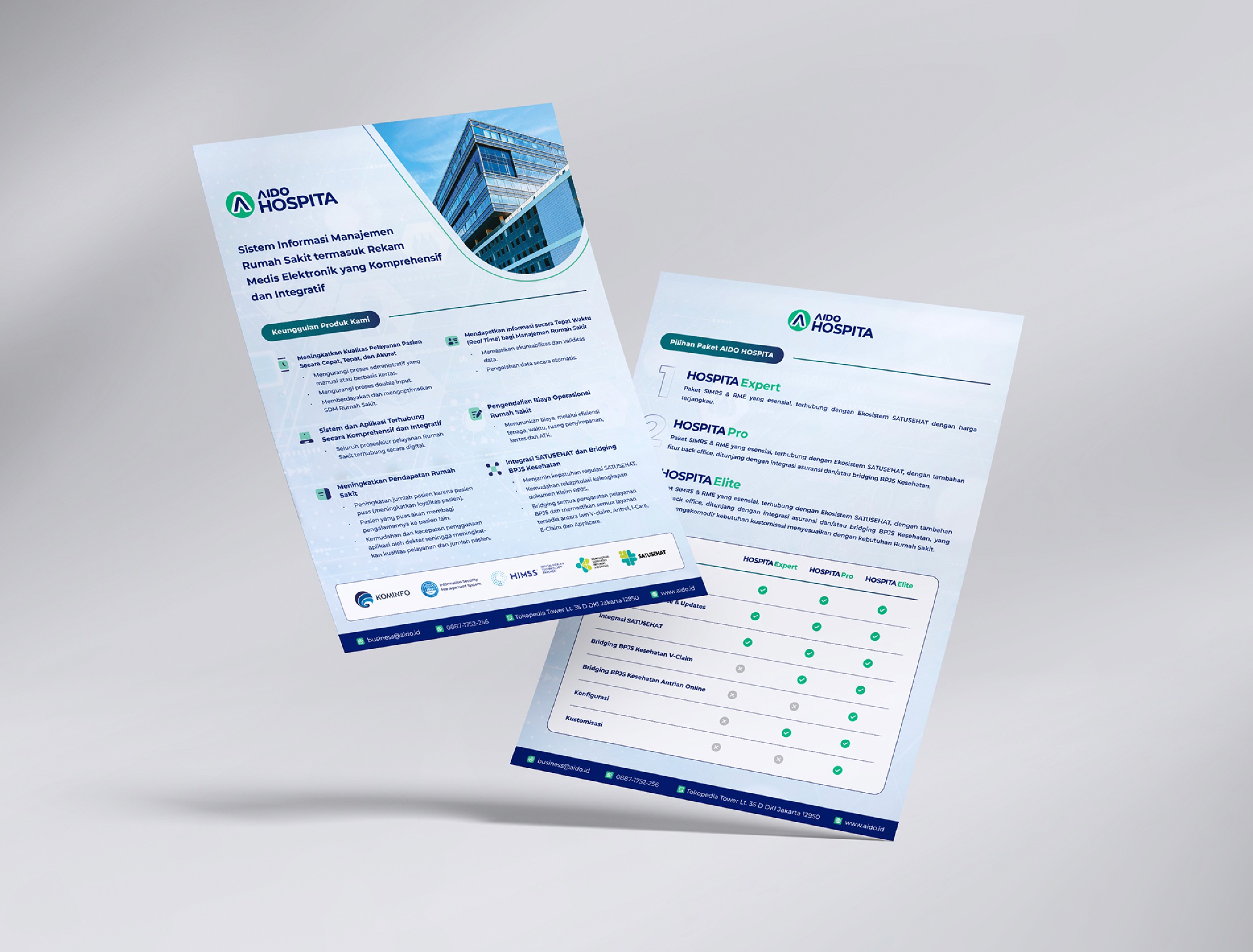 AIDO HOSPITA is a hospital management SaaS focusing on SIMRS and EMR. This design maintains consistency across print, and marketing materials. Clear print materials reflect healthcare standards, while marketing assets highlight key features with a unified brand identity.