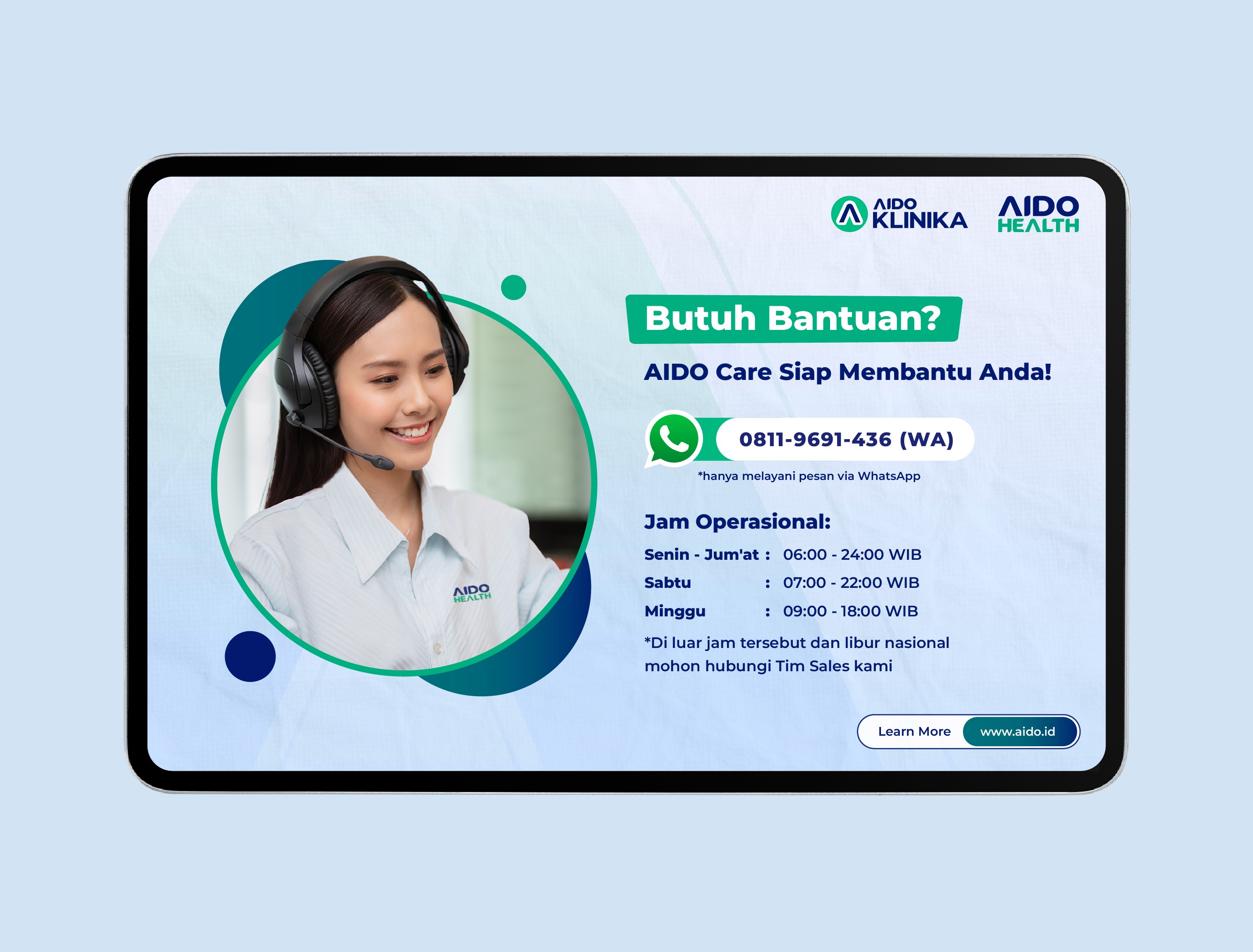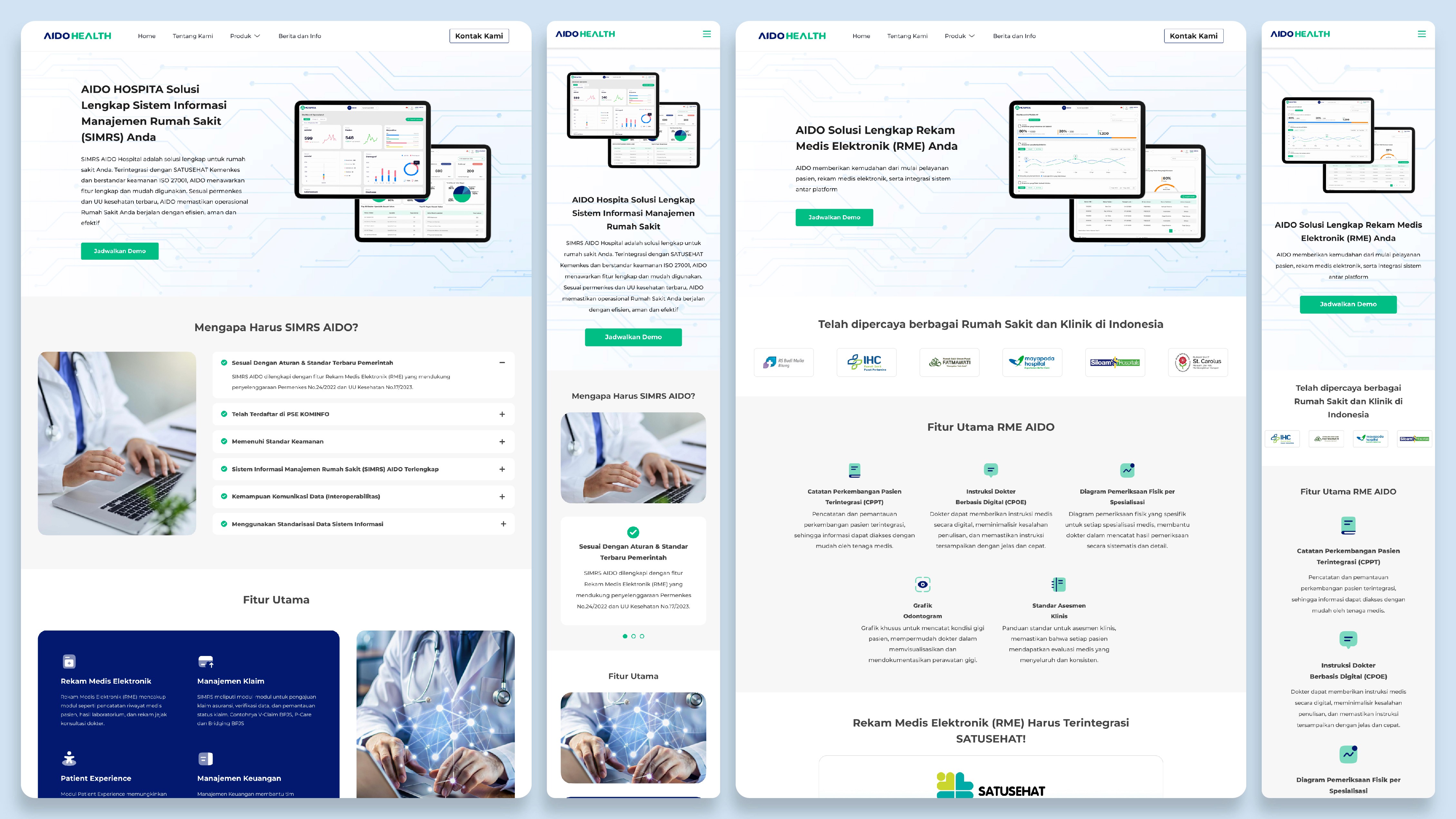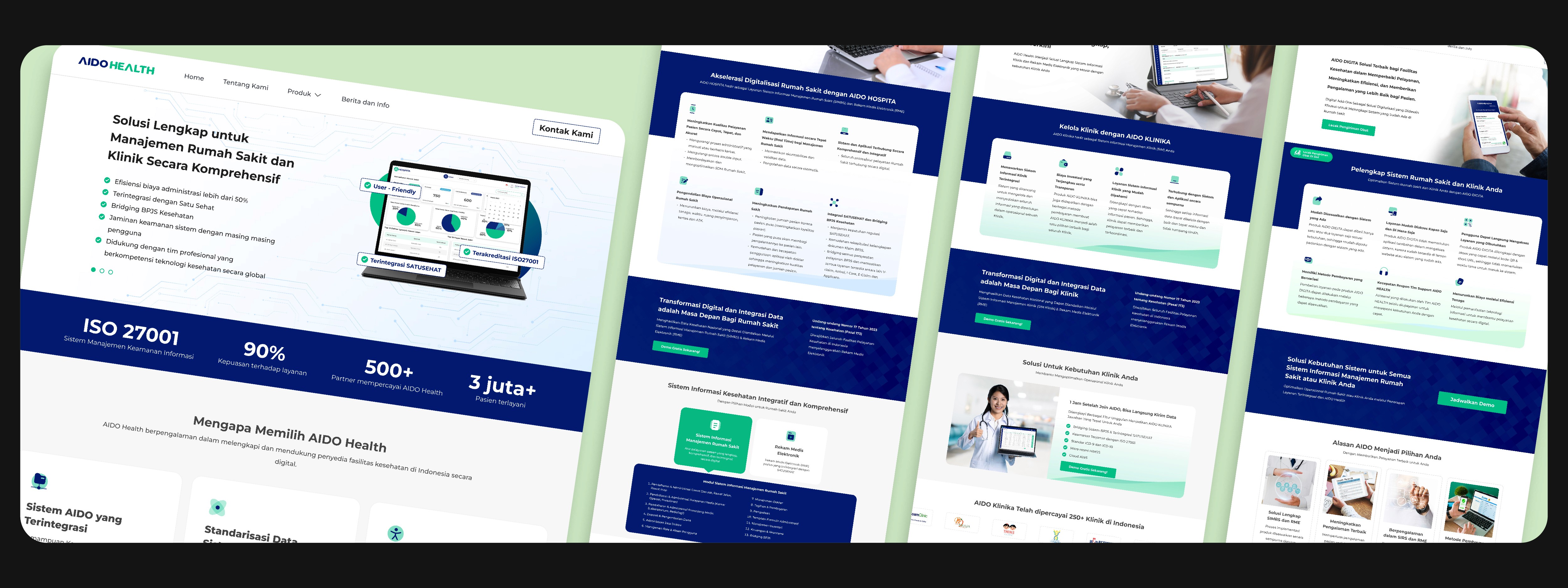 AIDO HOSPITA is a hospital management SaaS focusing on SIMRS and EMR. This design maintains consistency across print, and marketing materials. Clear print materials reflect healthcare standards, while marketing assets highlight key features with a unified brand identity.